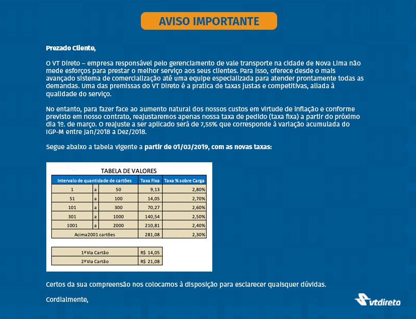 Em decorrência de alterações no sistema bancário para pagamentos através de boletos, os quais necessitam estar previamente cadastrados para serem aceitos orientamos, provisoriamente, até que os ajustes sejam devidamente adequados pela Rede Bancária, que os boletos referentes às recargas do VTE sejam gerados um dia antes da sua programação de pagamento, a fim de evitar transtornos na quitação dos mesmos, pela não aceitação do pagamento.